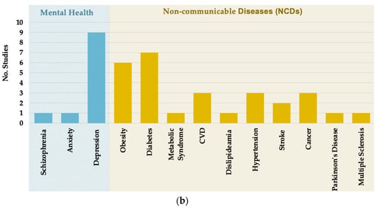 Studies examined a wide range of mental and physical health outcomes. Depression was the most frequently studied (n = 9) mental health outcome. One study examined anxiety and another schizophrenia. Ten different types of NCDs were identified, of which diabetes (n = 7), obesity (n = 6), CVD (n = 3), hypertension (n = 3), cancer (n = 3) and stroke (n = 2) were most frequently studied (Figure 2b).