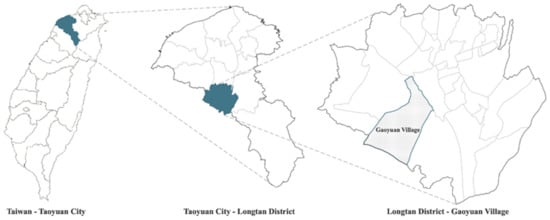 The study was conducted at Gaoyuan Village, a peri-urban Hakka settlement located in Longtan District, Taoyuan City (Figure 1), which is situated in the northwest of Taiwan and one of the six special municipalities. Gaoyuan is a rural community, formerly known as “Tong Luo Circle”, and is one of the highest areas on the Taoyuan Plateau which dominates the city’s landscape with its relatively flat topography. The soil is mostly infertile red clay and the community is sparsely populated. As there is no major river for irrigation, the lack of water resources led to ponds being built across the region in the early days for crop irrigation which reached its peak in the 1950s. These ponds have been a prominent feature in the landscape, and such agricultural facilities are normally situated in the comparatively flat lowland areas where it is appropriate to store rainwater and collect surface runoff. Nevertheless, industrialization and economic development have reduced the number of ponds. This has led to a gradual decline in the irrigation function of the pond system. Many ponds were buried because of land demands, or abandoned due to agricultural decline. Numbers have declined dramatically with many of the associated plants and animals now on the verge of extinction, making large changes to the local environment. It is therefore imperative to protect the original ecological functions of the ponds. The unpredictable heavy rainfall usually damages agricultural roads and leads to crop losses, as well as posing a significant threat to the lives and properties of residents.