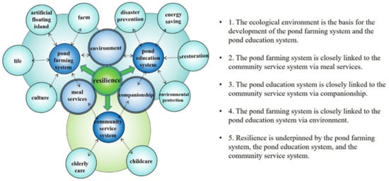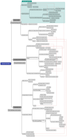 Overall, as shown in Figure 5, the pond farming system produces non-toxic vegetables and provides healthy meal services, which are integrated with the care of the elderly and children, allowing the community service system in Gaoyuan to achieve highly consistent results. The pond education system implements community-oriented environmental education, using the pond as a demonstration site that integrates disaster prevention with environmental-protection-related activities. With different types of community capital embedded in an interrelated network, the Hakka settlement is situated in the front line of societal development confronting a low birth rate, population aging, demographic changes, climate change, and environmental degradation by trying to demonstrate what a resilient community may look like.