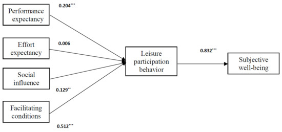 This study was an effort to test the significance of the proposed hypotheses on the basis of the UTAUT. The SEM technique was performed, and the structural model was assessed by χ2/df and fit indices. The fit indices consisted of the goodness of fit index (GFI), adjusted goodness of fit index (AGFI), root mean square error of approximation (RMSEA), comparative fit index (CFI), and normed-fit index (NFI) [62]. The model fit was good (χ2/df = 2.082, GFI = 0.885, AGFI = 0.870, RMSEA = 0.043, CFI = 0.963, NFI = 0.932). All indicators showed a satisfactory fit between the hypothesized model and the data [64]. Figure 3 shows the results of hypothesis testing. The estimates of the standardized coefficients revealed that the linkages between performance expectancy and leisure participation behavior (β = 0.204, p < 0.001), between social influence and leisure participation behavior (β = 0.129, p < 0.01), between facilitating conditions and leisure participation behavior (β = 0.512, p < 0.001), and between leisure participation behavior and subjective well-being (β = 0.832, p < 0.001) were all positive and significant. Therefore, Hypotheses 1, 3, 4, and 5 were supported. However, the linkage between effort expectancy and leisure participation behavior was not significant. Hypothesis 2 was not supported. The findings revealed that performance expectancy, social influence, and facilitating conditions were positively correlated with leisure participation behavior. Based on the estimates of the standardized coefficients (Figure 3), the effect of facilitating conditions on leisure participation behavior was greater than performance expectancy and social influence.