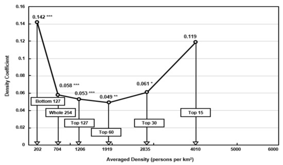 2 generated the highest density coefficient of +0.142, whereas the top 15 high-density cities also generated an equally high density coefficient of +0.119. In the remaining subgroups, the density coefficient clustered closely around the density coefficient derived from all 254 cities. Thus, the overall distribution of density coefficients resembled a U-shaped pattern, which is opposite to the inverse U-shaped EKC.