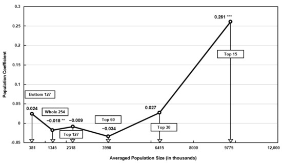 In sum, the robustness test with threshold regression using the subgroups of alternative population size for the top 94 cities and the bottom 160 cities improved the statistical validity for the subgroup of cities with large populations. However, the basic piecewise linear pattern of population coefficients remained essentially intact.