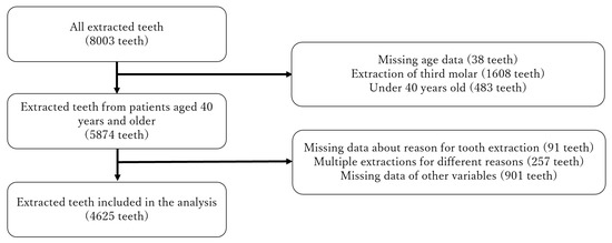 In total, 2345 dentists responded to the survey (response rate, 44.8%). Figure 1 shows the selection of extracted teeth for the analysis. A total of 8003 teeth were extracted from 6541 patients during the observation period; 4625 extracted teeth from 3750 patients (1815 males and 1935 females; mean age, 66.9 ± 11.9 years; age range, 40–97 years) were analyzed in this study. The mean number of extracted teeth per patient was 1.23 ± 0.63 (range, 1–9 extracted teeth per patient).