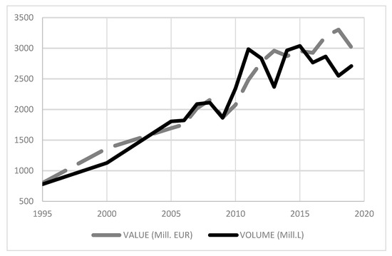 Since 1995, the first year for which data are available, Spanish wine exports have multiplied by five in both value and volume, growing from a little more than 500 million litres to 2690 million litres in terms of value and 2124 million litters in terms of volume. Nonetheless, the evolution of volume and value of wine exports has had ups and downs over the years. At the end of the 20th century, growth, which had stagnated since 1980 due to the prevailing economic crisis, picked up again, continuing until 2011, with a downward trend that lasted until 2013, mainly as a result of a lower volume of production.