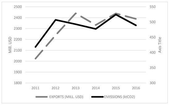 Recent variations in exports (Mill. USD) and emissions (ktCO2), 2011–2016.
