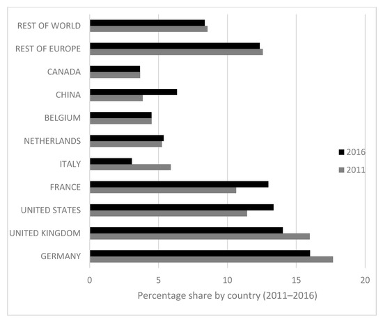Finally, Figure 4, which shows the changes recorded between 2011 and 2016 for emissions and economic value of Spanish wine exports (Mill USD) by country, highlights the differences in the variations between both variables. Although exports and emission moved in the same direction, they varied in intensity. Taking the specific case of Germany, for example, it can be seen that the emissions derived from these sales grew at a lower rate than the value of their imports between 2011 and 2016. This pattern is repeated for all the other countries except the Netherlands, suggesting that more sustainable methods of distribution were used, since, despite the growing amount of trade, the increase in emissions was proportionally lower in most of the countries. Consequently, it can be said that sustainable growth has emerged as an objective of the wine supply chain [14,75], driving companies to develop and implement new environmentally friendly behaviours [70].
