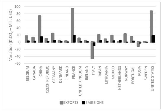 Variation of emissions (ktC02) and exports (Mill. USD) (2011–2016).