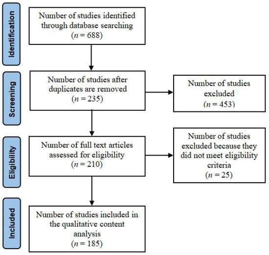 The third phase involves selecting the final samples for detailed analysis. The search is limited to the title and the abstract to focus on the search results. Titles and abstracts of all initial articles are screened for checking the relevance to e-waste. This leads to the identification of 235 relevant articles. Duplicate articles are removed. A total of 210 articles is assessed for eligibility, and after excluding those articles that did not meet eligibility criteria, a total of 185 articles is identified for further review.