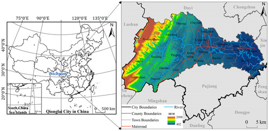 Qionglai City is situated in the center of Sichuan Province, at 30°12′ N~30°33′ N and 103°04′ E~103°45′ E. It is located in the transition zone between the Chengdu Plain and Longmen Mountain and covers an area of 1377 km2, with 1 street, 19 towns, and 4 townships under its jurisdiction (Figure 1). The overall terrain decreases in altitude from the northwest to southeast, with the highest elevation of 1991 m and the lowest of 451 m. The area contains mountains, hills, and flatlands. To the east and northeast of the city are flatlands over an area of 311.36 km2. The mountainous area is 817.79 km2, with the Wumian and Changqiu Mountains in the south and the southern extension of Longmen Mountain in the west. The northwestern margin of the central area consists of deep hills over 245.98 km2. The river in the territory is 271.25 km long with abundant water resources. Qionglai City has a subtropical humid monsoon climate, with an average annual temperature of 16.3 °C, total rainfall of 1117.3 mm, 1107.9 h of sunshine, and 1024.92 mm of annual evaporation. The main soil types are aquic soil and purple soil. The vegetation features subtropical evergreen broad-leaved forests mainly distributed in the northwest low mountains and central hilly areas. Qionglai is the national new center of the western part of Tianfu New Area of Sichuan Province, with a focus on ecology and the tourism industry. In 2020, the city’s GDP was 33.073 billion yuan.