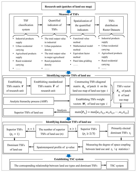 Land use is a physical form of expression of territorial space. Due to differences in resources, the suitability of land for various uses, and the diversity of social needs, the same kind of land use can accommodate different TSFs, resulting in a complex interaction between them. On the one hand, the same kind of land use entities can realize different TSFs through different methods of utilization (e.g., woodland can serve the raw materials production function by providing wood and forest by-products, or serve as an aesthetic draw for tourists); on the other hand, the same TSFs can be realized in different land use entities (e.g., natural ecological functions can be realized to varying degrees by forest lands, grasslands, and water bodies). Therefore, to clarify the dominant TSFs among land use entities, we need to classify territorial space and quantify and identify the superior TSFs. Then, based on the spatiotemporal heterogeneity of these superior TSFs in the context of land use, we need to identify the dominant TSFs to establish the corresponding relationship between land use types and TSC. This can help realize “nonobjective” TSFs expressed through “real” land use, provide a link between statistical data and the results of planning of land classification systems, and can increase the sources of available data for territorial space planning. The research framework is shown in Figure 2.