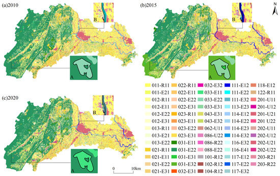 Spatial distribution of the land use superior TSFs in Qionglai. (a–c) are spatial distribution of the land use superior TSFs in 2010, 2015 and 2020. R11, E11 and so on have the meanings stated in Table 2; 011, 012 and so on are the land class code, have the meanings stated in the land use status classification in China (GB/T 21010-2007); e.g., 102-R11 indicates that the superior TSF of paddy field is agricultural products supply.