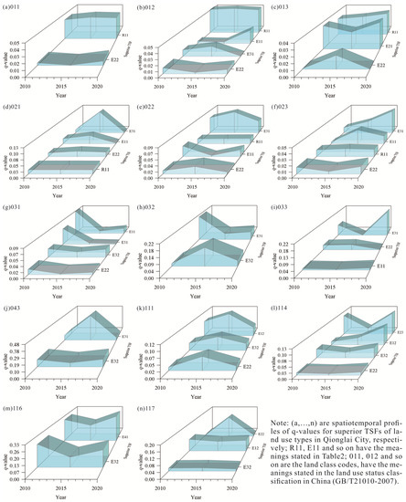 Spatiotemporal profiles of -values for superior TSFs of land use types in Qionglai City during 2010–2020.