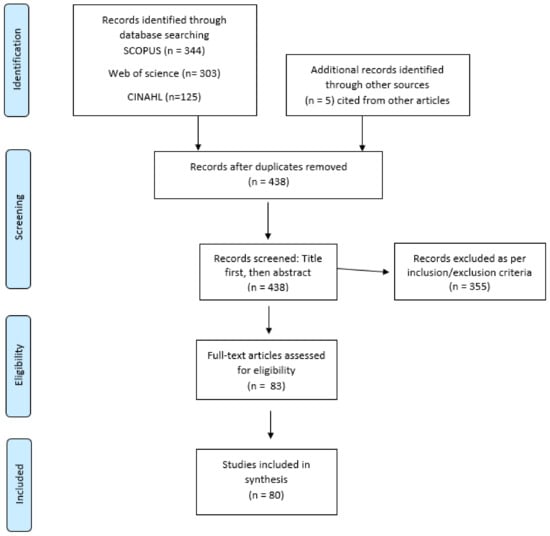 The search yielded a total of 772 papers. After the removal of duplicates, 438 records remained. Following the screening of titles and abstracts by two independent reviewers, this was reduced to a total of 83 papers.