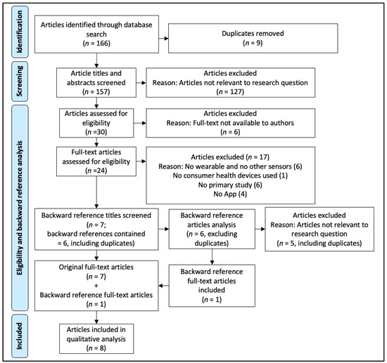We identified 166 articles in our initial search (see Supplementary Materials Table S1: Databases export). After we removed duplicates, a total of 157 articles were included for the title and abstract screening process. Among these, 30 articles seemed relevant, and we performed a full-text review/evaluation, resulting in a total of 7 articles being eligible and included in the study (see Supplementary Materials Table S2: Articles excluded) [16,17,18,19,20,21,22]. After we did a backward reference screening, we included one additional article [23]. Finally, eight articles were included in this systematic review. The detailed selection process is illustrated as a PRISMA flow diagram in Figure 1.