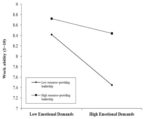 Simple slopes analysis revealed that in groups where leaders were low in resource-providing leadership, there was a negative link between emotional demands and work ability (simple slope = −0.48 (0.05), p < 0.001). In those work groups, the greater employees’ emotional demands, the lower their work ability was. For high values of resource-providing leadership, this relationship was reduced (simple slope = −0.14 (0.07), p = 0.051). In work groups led by high resource-providing leaders, emotional demands were not significantly linked with work ability. The difference between high and low resource-providing leadership was most pronounced for high values of emotional demands, where low resource-providing leadership was linked with a substantial reduction in work ability compared to high resource-providing leadership (simple slope = 1.13 (0.18), p < 0.001). When emotional demands were low, the difference was smaller, but the work ability of individual employees was still better in work groups led by high resource-providing leaders than in work groups led by low resource-providing leaders (simple slope = 0.35 (0.17), p = 0.04).
