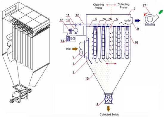 Bag filter example: 1. Separation chamber; 2. Dust laden gas inlet; 3. Baffle plate; 4. Rotary valve; 5. Filter bags; 6. Cell plate; 7. Filter Cage and Venturi; 8. Clean gas chamber; 9. Clean gas outlet; 10. Compressed air tank; 11. Diaphragm valve; 12. Blow pipe, 13. Water trap; 14. Sequential controller; 15. Falling dust; 16. Filtration chamber; 17. Suction fan [].