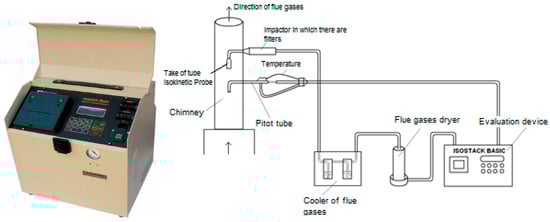 To start the measurements, the reference O2 = 21% and the humidity in the pipe, measured with a multifunctional device TESTO 400 Flue Gas Analyzer (Keison products, Kirchzarten, Germany), must be entered in the ISOSTACK BASIC (TCR Tecora SRL, Via delle Primule, 16,Cogliate (MB), Italy). The device then automatically calculates all the indicators necessary to determine the concentration of dust (flow, speed, temperature, and dynamic pressure in the pipe, as well as the volume of wet and dry gas extracted in the set time—30 min/cartridge).