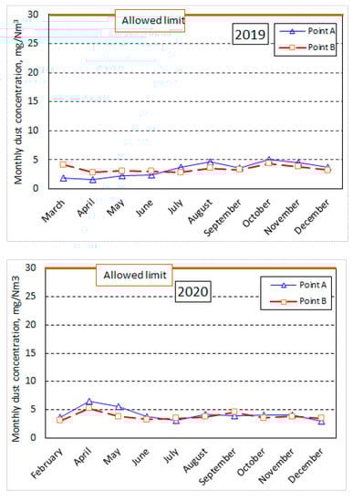 Generally, the mean values recorded on the sampling days and hours in the months listed in Table 1 were within the prescribed normal limits (30 mg/Nm3), with minor variations from one month to the next (as shown in Figure 4). However, higher values of dust emissions at other hours of the factory’s work schedule or other days of the month in which samples were taken were not excluded.