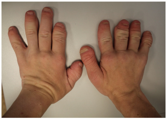 - Fujioka, H.; Tanaka, J.; Yoshiya, S.; Kokubu, T.; Fujita, K.; Makino, T.; Mizuno, K. Proximal translation of the radius following arthroplasty of the distal radioulnar joint in Hajdu-Cheney syndrome. J. Shoulder Elb. Surg. 2003, 12, 97–100. [Google Scholar] [CrossRef][Green Version]