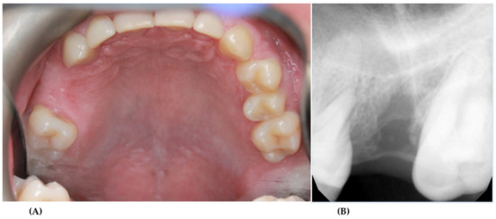 Intraoral photographs after 10th mouths after surgical treatment (A); dental X-ray—10th months after 27 extraction—stabilization of bone healing (B).