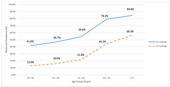 Prevalence of nocturia in different age groups.