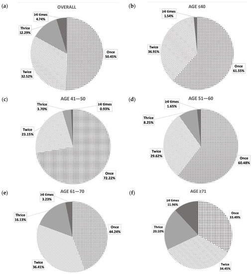 Distribution of nocturia episodes in: (a) the overall studied nocturia population, which was divided into different age groups at: (b) 18–40 years; (c) 41–50 years; (d) 51–60 years; (e) 61–70 years; and (f) ≥71 years.