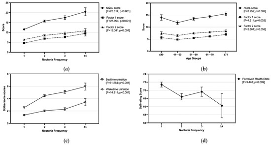 Nocturia-related QoL, bothersome caused by nocturia, and health state perceived by the individuals with nocturia, are presented as the trends of: (a) NQoL score and factor scores against the increasing nocturia frequency, and (b) against the advancing age groups, and (c) the bothersome score and (d) the health state score against the increasing nocturia frequency.