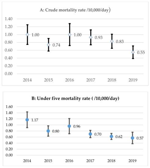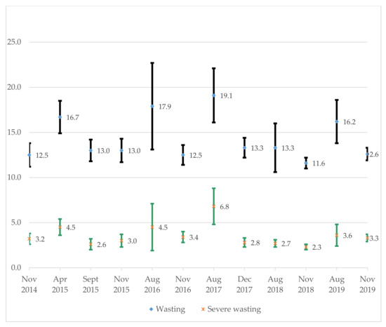 Figure 1 and Figure 2 provide trends in CMR, U5MR, and wasting prevalence. CRM declined significantly from 1.00 (95% confidence interval (CI): 0.75, 1.25) per 10,000 persons per day in 2014 to 0.55 (95% CI: 0.39, 0.70) in 2019. A similar trend was observed for U5MR, which declined from 1.17 (95% CI: 0.91, 1.43) per 10,000 live births per day in 2014 to 0.57 (95% CI: 0.38, 0.76) in 2019. Both CRM and U5MR remained below the emergency thresholds, suggesting that the emergency response was under control. However, between 2014 and 2019, the prevalence of wasting fluctuated according to the agricultural cycle. Nutrition surveys were often carried out twice a year: one survey during the lean season (i.e., the period of time between planting and harvesting when job opportunities were scarce and food stores were low; April to July) and another in the post-harvest period (October to December). Overall, wasting prevalence remained above the emergency threshold of 15% during the lean season, hence depicting a ‘very high’ public health concern of long-lasting nature.