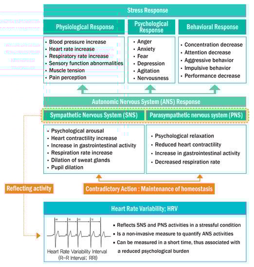 Stress induces physiological, psychological, and behavioral responses caused by ANS stimulation. Stress responses are observed amid the contrasting actions of the sympathetic nervous system (SNS) and parasympathetic nervous system (PNS), which form the ANS. HRV reflects the related activity level [] and is an index of the time-varying differences between two adjacent heartbeats that have been used for the objective evaluation of mental health and stress []. Figure 1 describes stress-induced physiological, psychological, and behavioral reactions manifested by SNS and PNS interactions with ANS stimulation. The relationship between HRV and the ANS is illustrated in Figure 1.