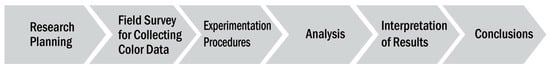 The order of exposure to the color stimulus material is presented in Figure 6. The order was determined by randomizing the materials for Groups A, B, and C []. Before the experiment, participants’ eyes were covered with an eye patch, and they were allowed to rest for 5 min []. They were then exposed to each of the experimental stimuli for 2 min and 30 s [,].