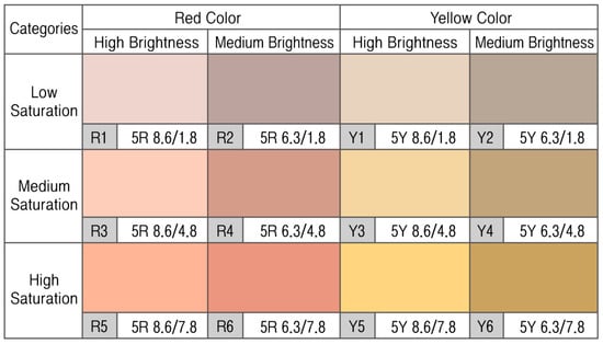 With the color of a wall that was the most sizable visual area as the reference, the average brightness and saturation values were used as the reference values for the test stimulus; the red and yellow hues were selected based on our review described in Section 1.1. High brightness at 8.6 and medium brightness at 6.3 were selected as the reference, and these numbers were the average brightness values of a dominant color and accent color, respectively. The reference for saturation was chosen by starting from the average saturation of the dominant color at 1.8 and increasing it by 3 degrees; the low, medium, and high saturation levels were 1.8, 4.8, and 7.8, respectively. The color samples applied to our experiment regarding the HRV for different stress groups are displayed in Figure 3.
