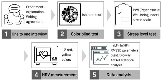 The experiment was conducted in five steps (Figure 5). Steps 1, 2 and 3 corresponded to a pre-experimental stage. Step 1 was a one-on-one interview with the participant. Step 2 examined the participants who consented to participate in the study for color blindness or color weakness. Step 3 assessed the participant’s stress level by using the PWI stress scale. Step 4 measured HRV in a color environment. At step 5, we carried out a t-test statistical analysis on the ln(LF), ln(HF), and RMSSD parameters. Focusing on the In(LF) parameter showing significant results, the interactions between hue, brightness, saturation, and the stress group were verified through a two-way ANOVA analysis.