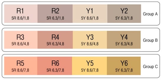 Color is perceived by human vision and is a factor affecting emotions; an individual’s emotional status is an independent factor affecting the HRV []. Thus, emotional evaluation of color, in addition to the HRV measurement, will allow multifaceted interpretations of our study outcomes.