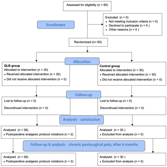 A sample size was calculated based on data from a pilot study previously published and from similar clinical trials [11,12,13]. Assuming a type 1 error of 0.05 and a study power of 0.8, we included 30 patients per group into the study, also allowing for missing data. The collected data were expressed as minimum and maximum values, median (range), mean, and standard deviation. The results were analyzed by using SPSS 19 (SPSS, Chicago, IL, USA) with a level of significance at p = 0.05. The Shapiro–Wilk test was used to test for normality. A non-parametric Mann–Whitney U test was used when the obtained values did not follow a normal distribution. An assessment of whether elapsed time had a significant impact on the levels of satisfaction of the studied patients was made and whether similar changes occurred in both the control group and QLB I group. As the assumption of sphericity was not met, a multivariate analysis of variance was made with a Greenhouse–Geisser test. A Chi-square test was used to compare responses collected from the chronic postsurgical pain phone survey. It was not possible to define numerical statistical differences between the groups in the questionnaire given to patients after 48 h of care.