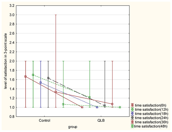 Evaluation of satisfaction with pain therapy, using the three-step scale (highly satisfied, satisfied, and dissatisfied), showed a statistically meaningful difference between the groups in 6, 12, 18, 24 and 36 h after the cesarean section (p < 0.05) However, no difference was seen after 48 h from surgery (p = 0.17) (Table 2). Elapsed time from the surgical procedure had a significant impact on the satisfaction of the studied patients in both groups. Moreover, group allocation had a significant influence on the variability of the satisfaction parameter in favor of the QLB group (p = 0.000) (Figure 2).