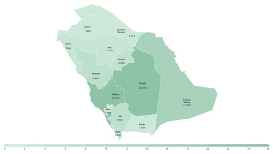 A proportional quota sampling technique was used to generate an equal distribution of participants based on three variables (age, sex, and region). The regions included the 13 administrative regions of Saudi Arabia (Aljouf, Northern Borders, Tabuk, Hail, Madinah, Qassim, Makkah, Riyadh, Eastern Region, Baha, Asir, Jazan, and Najran). Figure 1 shows a map of Saudi Arabia, highlighting its regions and their adult population proportions. We used two age groups, which were established based on the median age of Saudi Arabian adults (36) (age group 1: 18–36; age group 2: 37 and above). Thus, 52 sampling quotas were generated. The required sample size was calculated based on a medium effect size of approximately 0.25, with 80% power and 95% CI, to compare age and sex across regions []. Ninety participants were required to meet each quota, and the total targeted sample size calculated for this study was 4680 participants.
