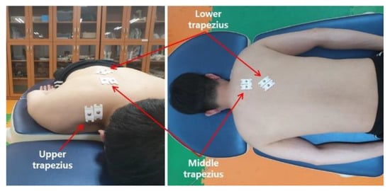 To analyze the EMG activity of the UT, MT, and LT of the dominant shoulder during PSHA exercises, a surface EMG system (wireless miniDTS; Noraxon, Inc., Scottsdale, AZ, USA) was used. Two bipolar surface electrodes were attached at a 2-cm interelectrode distance on the muscle fiber of each muscle, as previously described [24]; the details are provided in Figure 1 and Table 1. EMG data were collected and analyzed using MyoResearch 3 software (Noraxon, Inc., Scottsdale, AZ, USA). EMG data were collected at 1500 Hz, at a bandwidth of 10–450 Hz; they were then full-wave rectified and converted to root mean square values. In a previous study, high or excellent reliability was reported by intraclass correlation coefficient for the measurements of trapezius muscle activation using surface EMG (UT: 0.85–0.97, MT: 0.89-0.97, and LT: 0.86–0.91) [10].