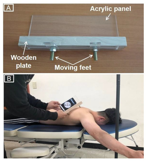 Custom-built measurement plate (A) and measurement of scapular posterior tilt using the custom-built measurement plate and an inclinometer (B).