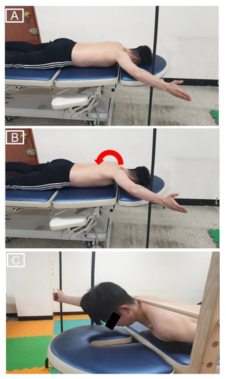 Participants performed three PSHA exercises (preferred PSHA, PSHA with the intended scapular posterior tilt, and PSHA with the intended scapular posterior tilt and trunk extension). During all PSHA exercises, a steel pole was used to guide the participant into the 125° shoulder abduction position. For preferred PSHA, the participant lay in the prone position, placed the dominant arm on the table with elbow extension, performed external rotation to 125° shoulder abduction, and then raised the arm as high as possible without trunk rotation (Figure 4A) [15]. For PSHA with the intended scapular posterior tilt, the participant positioned the dominant arm in the same manner as in preferred PSHA, then performed the intended scapular posterior tilt. The participant was instructed to raise the arm while maintaining the intended scapular posterior tilt (Figure 4B). For PSHA with the intended scapular posterior tilt and trunk extension, the participant performed PSHA with the intended scapular posterior tilt as described above, then raised the chest approximately 10 cm from the table [18]. To control the amount of trunk extension, the participant was asked to maintain the 7th cervical vertebra in contact with the target bar during this exercise (Figure 4C). The participant maintained the raised arm position in the end range for 5 s for trapezius muscle EMG activity measurements during each PSHA exercise. Each PSHA exercise was repeated three times. A 1-min rest break was provided between trials and for 5 min between exercises.
