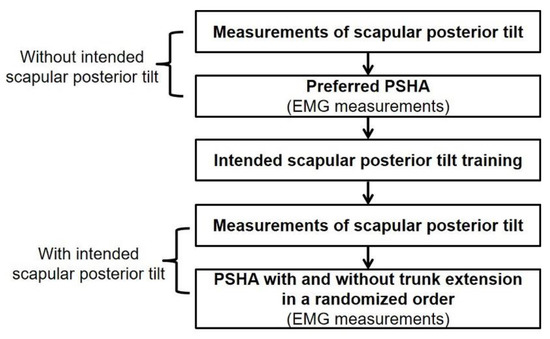 Participants performed preferred PSHA immediately after measurement of the scapular posterior tilt angle in the prone position under the condition without the intended scapular posterior. Next, the intended scapular posterior tilt training was performed to minimize the learning effects; the scapular posterior tilt angle was then measured in the prone position under the condition with the intended scapular posterior tilt. Finally, the participant performed PSHA with and without trunk extension under the intended scapular posterior tilt conditions in randomized order (Figure 5).