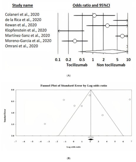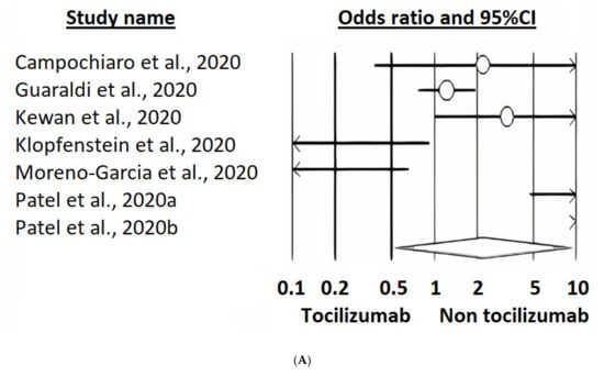 - WHO Rapid Evidence Appraisal for COVID-19 Therapies (REACT) Working Group; Shankar-Hari, M.; Vale, C.L.; Godolphin, P.J.; Fisher, D.; Higgins, J.P.T.; Spiga, F.; Savovic, J.; Tierney, J.; Baron, G.; et al. Association Between Administration of IL-6 Antagonists and Mortality Among Patients Hospitalized for COVID-19: A Meta-analysis. JAMA 2021, 326, 499–518. [Google Scholar] [CrossRef] [PubMed]