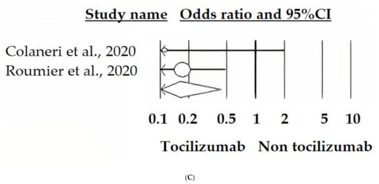 | Capra et al., 2020 [25] | Italy | 85 consecutive patients (62 cases versus 23 controls) | Laboratory- and radiologically-confirmed cases; critically ill patients requiring mechanic ventilation, with abnormal platelets and transaminases values were exclusion criteria | 63 [range 54–73]; younger than controls | 45(73%); less males among cases than among controls (73% versus 83%) | Tocilizumab + standard care versus standard care (hydroxychloroquine and lopinavir plus ritonavir) | 33 (53%) 400 mg i.v. once, 27 (43.5%) subcutaneous 324 mg once; 2 (3.5%) 800 mg i.v. | As soon as tocilizumab was available (within 4 days from admission) | Hospitalized, no one admitted to ICU, 5 under mechanical ventilation | Mortality |