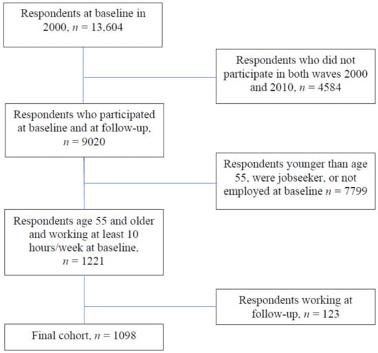 In the present study we included respondents who were 55+ and still working at least 10 h/week at baseline in 2000 and who did not work at follow-up in 2010. The final cohort ended up being 1098 respondents of whom 51% were men and 49% were women (Figure 1).