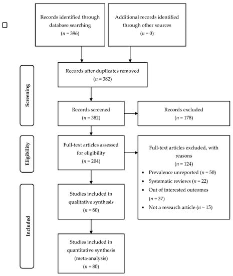 The initial search had identified 396 potentially relevant studies. A total of 14 duplicated studies was removed, and 382 studies were screened. After the screening of titles and abstracts, 178 studies were excluded. A total of 204 full-text articles were screened. In total, 124 studies were excluded due to unreported prevalence, systematic reviews, not reporting the outcomes, and not in the form of research articles. As a result, a total of 80 studies that met the inclusion and exclusion criteria was included in this review. The articles were published in 2020 (n = 56) and in early 2021 (n = 24) (Figure 1).
