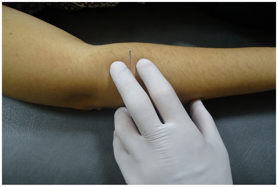 Several interventions are promoted for managing muscle tissues and trigger points, e.g., manual therapy, exercise, physical agents, or dry needling [3]. Dry needling has received particular attention for practitioners in the last decade [7]. The American Physical Therapy Association (APTA) defines dry needling as a “skilled intervention using a thin filiform needle to penetrate the skin that stimulates myofascial trigger points, musculature and connective tissue for the management of neuromusculoskeletal disorders” [8]. In fact, different forms of application of dry needling are described in the literature [9]. Probably the most expanded needling approach used for the management of muscle trigger points is the “fast-in, fast-out” technique as described by Hong [9,10]. This approach consists of inserting the needle into a trigger point until a first local twitch response is obtained [10]. Once a first local twitch response is obtained, the needle is moved up and down, in and out of the trigger point to obtain more local twitch responses [10]. A recent meta-analysis has found low to moderate evidence suggesting a positive effect of dry needling for pain and disability in individuals with lateral epicondylalgia [11]. However, there is a paucity in the literature regarding specific data of needling the supinator muscle. Similarly, a recent case report described the successful management of radial tunnel syndrome with dry needling [12]. This case report observed immediate improvement in all outcomes after the first treatment session, with complete relief of pain symptoms six months following the fourth treatment session [12]. The potential effects of dry needling are explained by both mechanical and neurophysiological effects including a decrease in spontaneous electrical activity, disruption of contraction knots, increase muscular blood flow and oxygenation, a decrease of pro-inflammatory mediators, and stimulation of peripheral nerve fibers and the release of endogenous opioid and neurotransmitters [13].