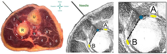Blue latex was injected to depict where the tip of the filiform needle was located to determine the accuracy of the insertion into the supinator. The needle was also left in situ during the anatomical procedure to assess the surrounding neurovascular bundles. Cross-sectional anatomical dissections of the upper third of the forearm were photographed and analyzed by photometry for measuring the following distances (Figure 2):