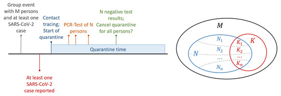 Left: Timeline of the events starting from the group event until the quarantine decision. Right: Overview of the group with M, the possible number of infected K, and the negative tested persons N. For N and K, the contact persons are divided into subgroups and , which are tested on day , are also illustrated.