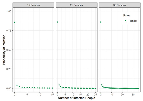 In this section, the school class scenario is further considered and the posterior probability is analyzed that no transmission occurred given that N out of M persons are tested negative. For this analysis, we used the prior specified for school classes which is determined in Section 3.1. In Germany, school classes have usually at least 13 and not more than 35 pupils [22]. Thus, we calculated this probability for different school class sizes and different numbers of tests N, which were all done 4 days after the group event. The results are shown in the left panel of Figure 3. This probability ranges from up to . One reason for this high minimum is the specific prior distribution, which should have the probability for no transmission. Thus, the posterior probability cannot be smaller than due to formula (2). Smaller values are only observed for , where no optimal parameters could be found with the optimization. Moreover, all determined posterior probabilities never reach because there is always some small remaining risk, that there could be some infected persons in the group, who were tested negative.