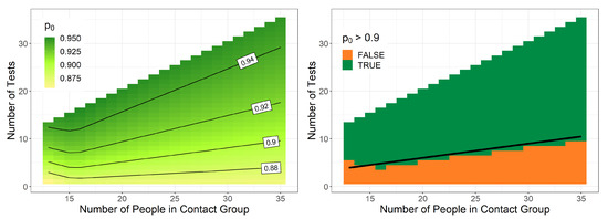With this calculated probability, one can make a decision whether the quarantine can be canceled despite the fact that not all persons have been tested. Using, for example, the rule , the quarantine will be canceled in most cases, as shown in the right panel of Figure 3. Only if less than around of the group size have been tested is the result less than , and the quarantine is continued.