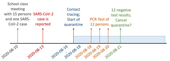 As a result, we now have 15 persons with last contact on August 10. Twelve persons were tested, and all test results are negative. One person was tested on August 18, ten persons on August 19, and one person on August 20. The timeline for this sequence of events is given in Figure 4. With this information, we can calculate the posterior probability, that nobody at all was infected according to our model. With the prior distribution determined for a school class with pupils, we obtain a probability of , that no transmission of COVID-19 occurred in this setting. Based on the described decision rule of suggested in Section 3.2, this result would support to cancel the quarantine for the whole group early. Indeed, no further COVID-19 cases were reported to the health department concerning this particular school class. Hence, the correct decision about cancellation of quarantine would have been made in this specific case.
